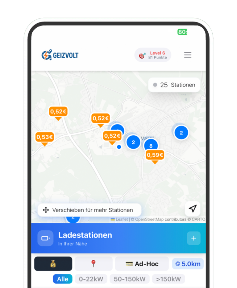 GeizVolt ist eine App und Web-Anwendung, mit der du Preise von Ladesäulen (AC & DC) in deiner Umgebung vergleichen kannst. Nutzer:innen melden Preise selbst, sodass du immer aktuelle Infos hast.